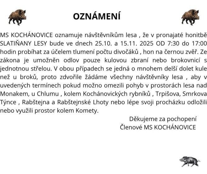 Upozornění pro návštěvníky lesů. Myslivecký spolek Kochánovice pořádá 25.10. a 15.11. 2025 od 7:30 do 17:00 hodin hon na černou zvěř. Promyslete odklad návštěvy lesů v těchto dnech, děkujeme!